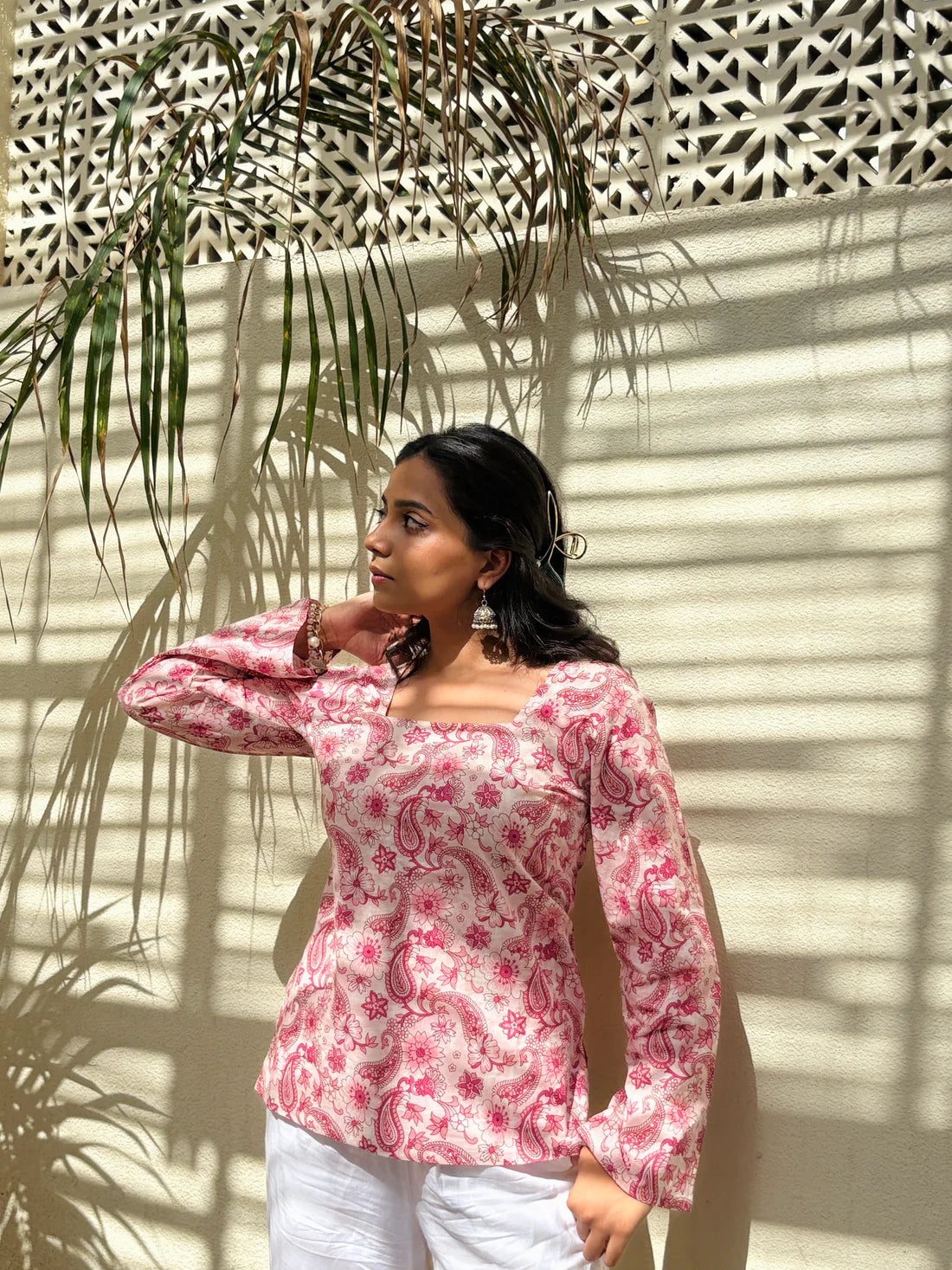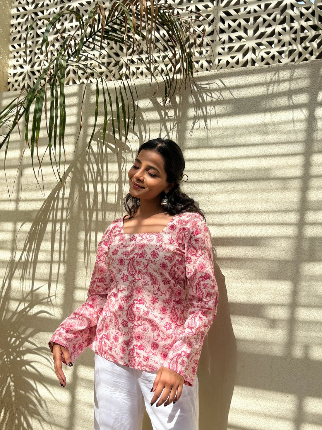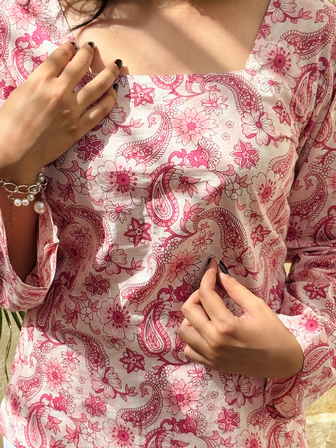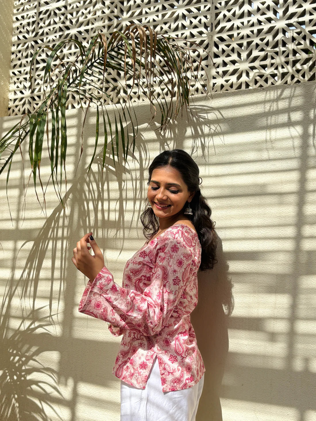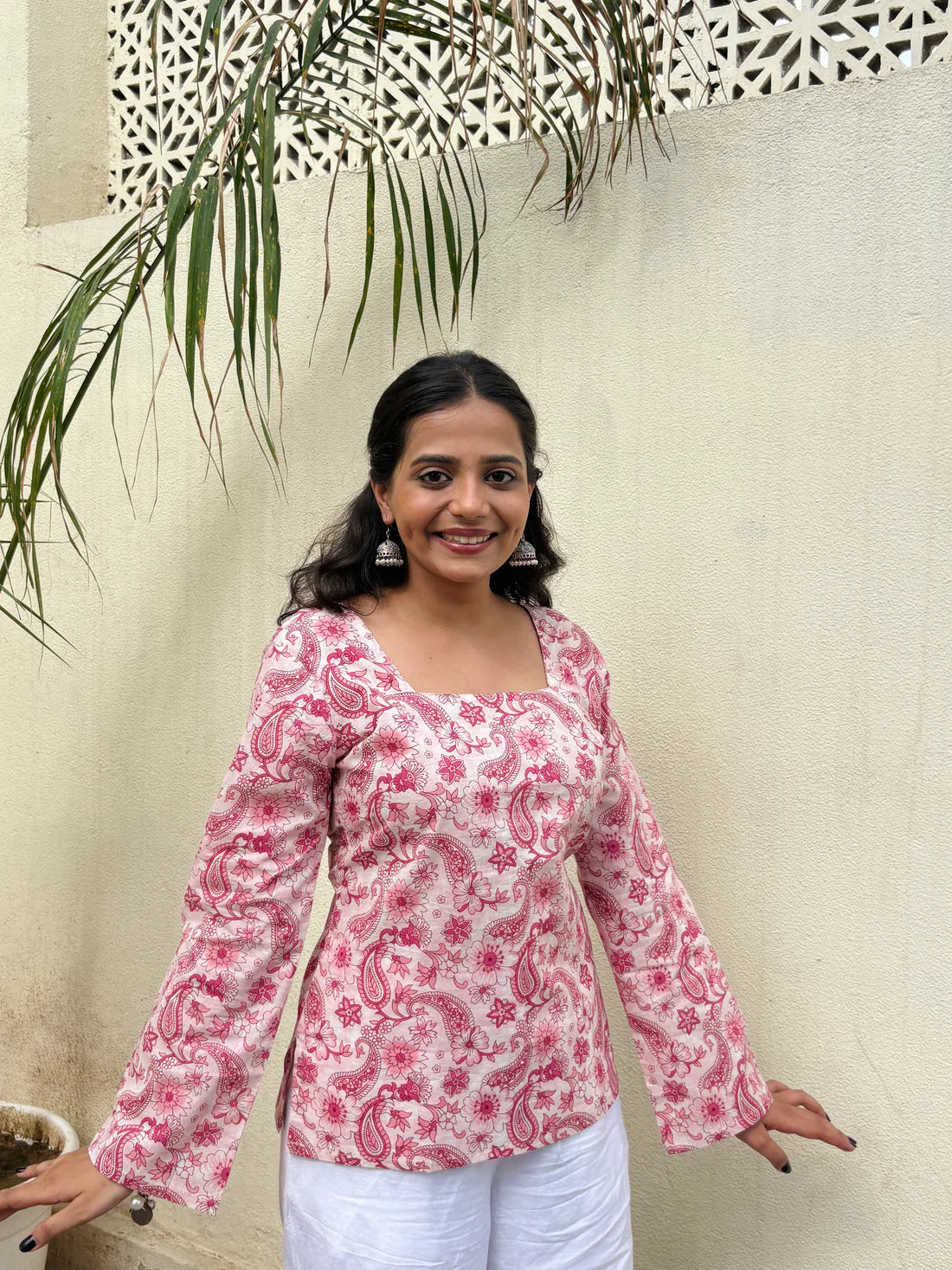 Meet The 'Blushing Bells' Tunic—your new go-to for effortless style. This short, fitted kurti is crafted from pure, comfortable cotton and adorned with a delightful all-over block print pattern. The combination of the classic square neckline and the on-trend flared bell sleeves gives it a unique, contemporary feel. Easy to pair with white trousers (as pictured), jeans, or even a skirt. It's a versatile piece that ensures you look polished and feel comfortable all day long.
