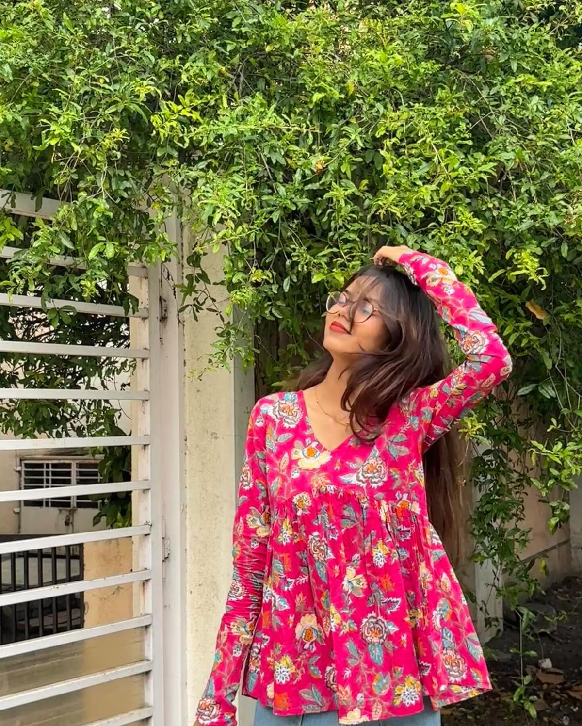 Embrace bohemian charm with The 'Bohemian Bloom' Tunic. This unique babydoll-style top is crafted from soft cotton and features an intricate all-over block print design. The vibrant pink print and flowing, voluminous silhouette ensure a comfortable yet fashionable look. The full sleeves and relaxed fit make it easy to wear year-round. Pair it with white leggings, slim-fit jeans, or wear it free-flowing for a relaxed, artistic vibe.
