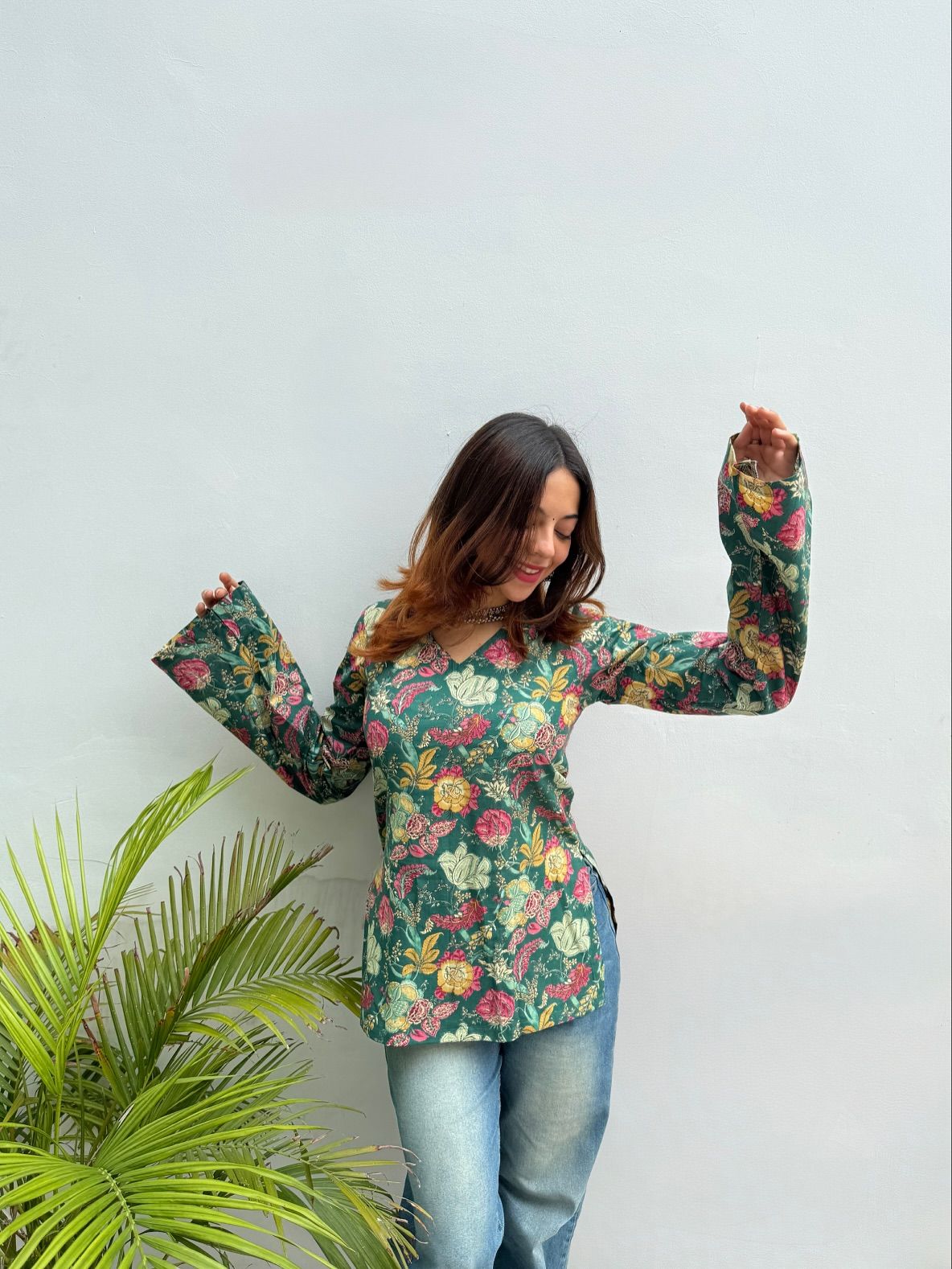 Meet the Emerald Blooms Kurti, a vibrant addition to your wardrobe. This piece showcases an exquisite hand-block floral print on a rich emerald green base. The straight-fit body is complemented by fashionable flared cuffs, offering a touch of playful movement. Made from breathable cotton, it provides maximum comfort without compromising on style. It's an ideal choice for fall and winter layering, or worn solo for a striking casual look.