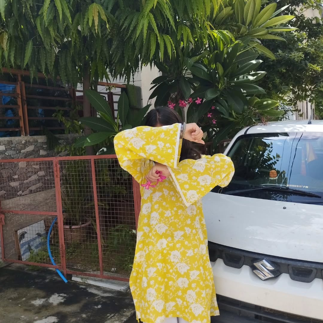 Embrace the joyous spirit of a bright day with this gorgeous Jaipur Lemon Tunic. This short, straight-fit kurti is cut from pure cotton and features a cheerful hand-block print design. The defining style element is the graceful flared or bell cuffs on the sleeves, which add a feminine, playful movement. It's a versatile piece that easily transitions from a casual day out to a festive brunch.