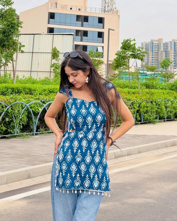 Meet your new favorite summer staple: the Indigo Block Print Strappy Top. This short kurti is cut in a stylish, straight silhouette and crafted from breathable cotton for ultimate comfort. The bold hand-block print offers a beautiful, rich contrast against the denim look. Featuring adjustable tie-up shoulder straps and a square neck, the fit is both secure and flattering. The small tassel or pom-pom trim provides a sweet, finished detail. Perfect for college, travel, or any relaxed day out.