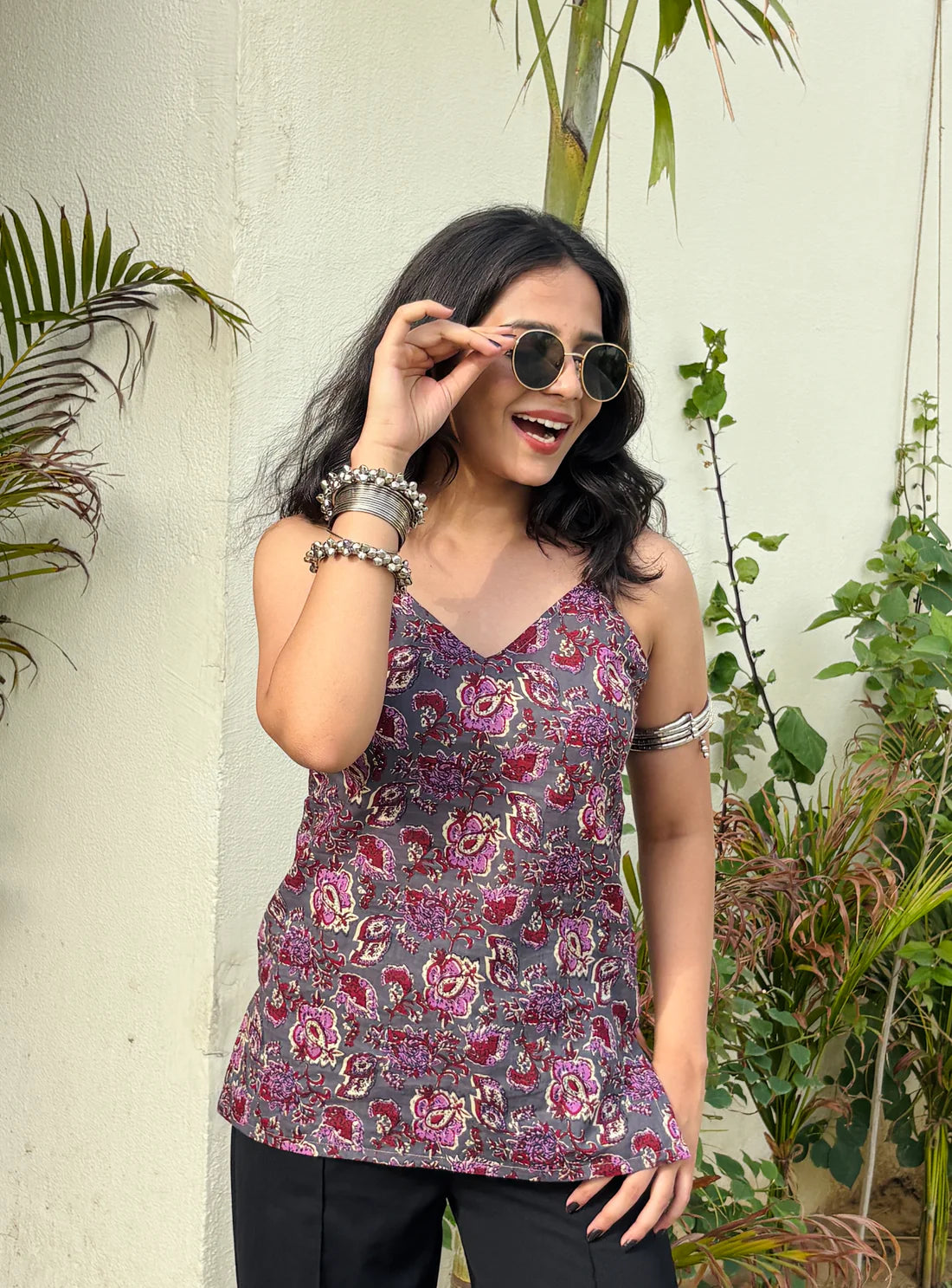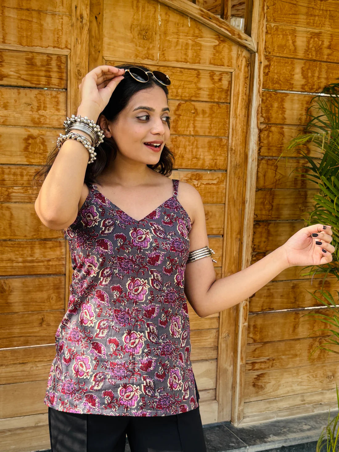 Bring the beauty of a bohemian garden to your wardrobe with this comfortable Cotton Strap Top. The rich, detailed all-over floral pattern is a beautiful example of traditional Indian block printing. Its simple, straight silhouette and lightweight fabric make it an ideal choice for summer heat. Dress it up with chunky silver jewelry and wide-leg pants for a festive look, or keep it casual with shorts and sunglasses. A versatile, must-have piece for relaxed elegance.