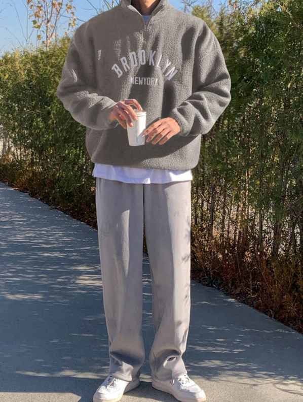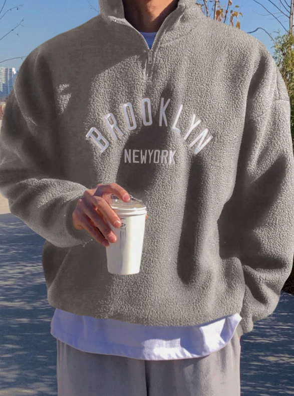 DAZY Men's Autumn Letter Embroidery Grey Half-Zip Fleece Pullover Sweatshirt