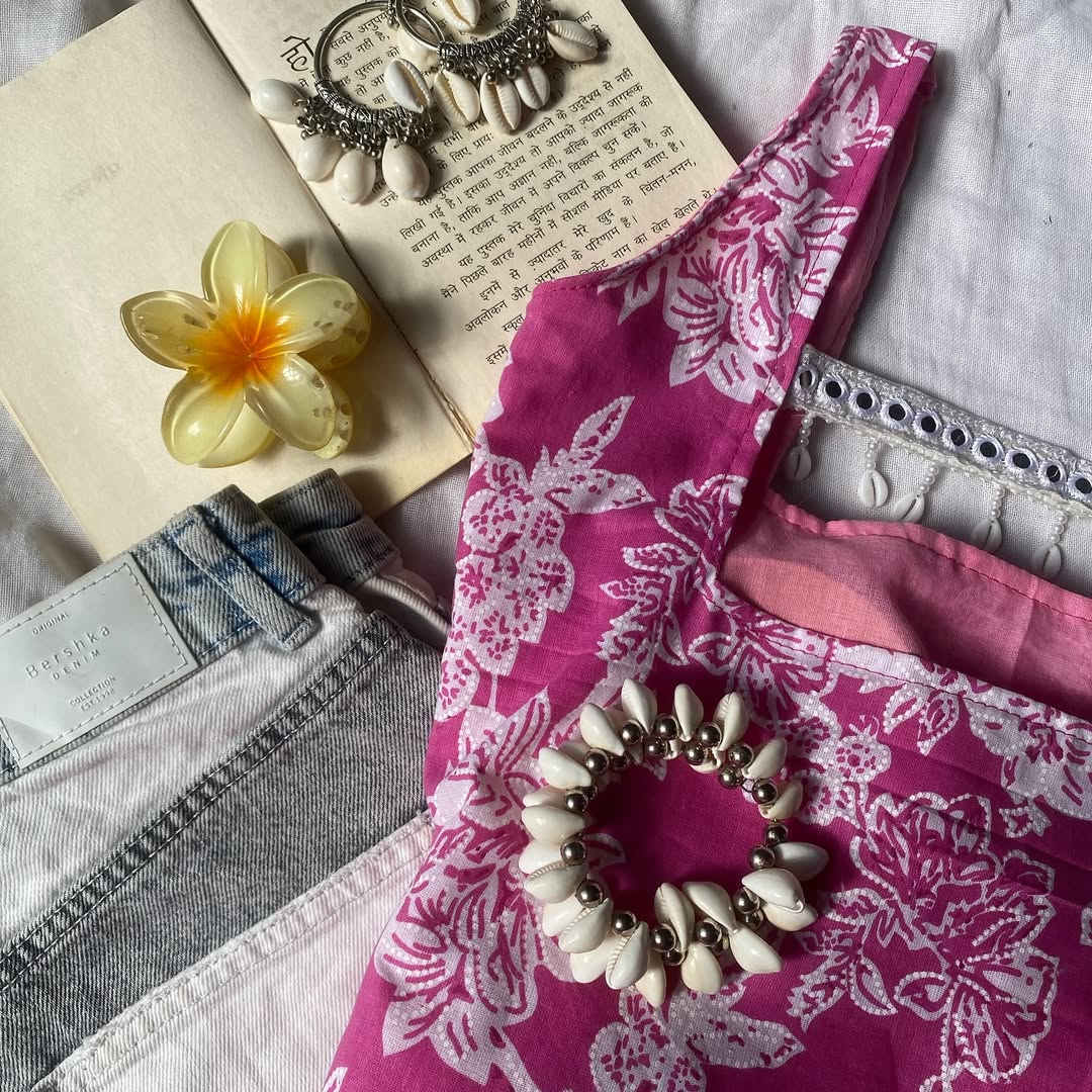 Meet The 'Desi Core' Camisole—a comfortable and stylish summer essential. This sleeveless top showcases a beautiful hand-block print design in contrasting pink and white. The simple, non-adjustable wide straps offer modesty and comfort, making it a great piece to wear on its own or to layer. The soft cotton fabric ensures you stay cool all day. A versatile top that brings a touch of traditional artistry to your modern casual wardrobe.